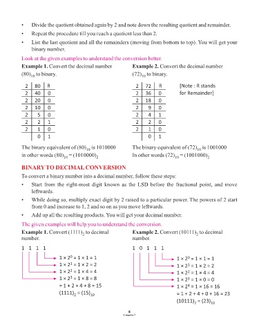 • Divide the quotient obtained again by 2 and note down the resulting quotient and remainder.