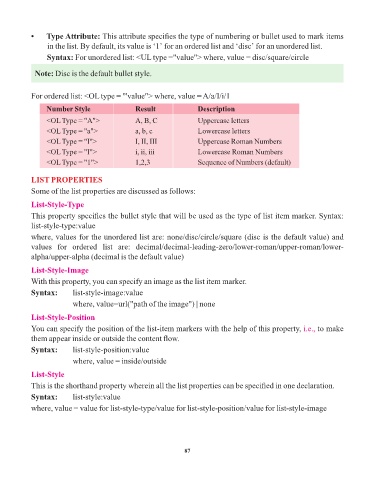 • Type Attribute: This attribute specifies the type of numbering or bullet used to mark items
