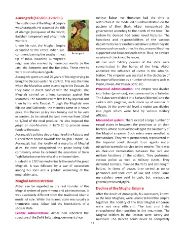 The sixth ruler of the Mughal Empire restructure it. He modelled his administration on the