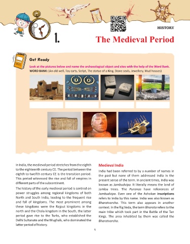 WORD BANK: (An old well, Toy carts, Script, The statue of a King, Stone seals, Jewellery, Mud houses)